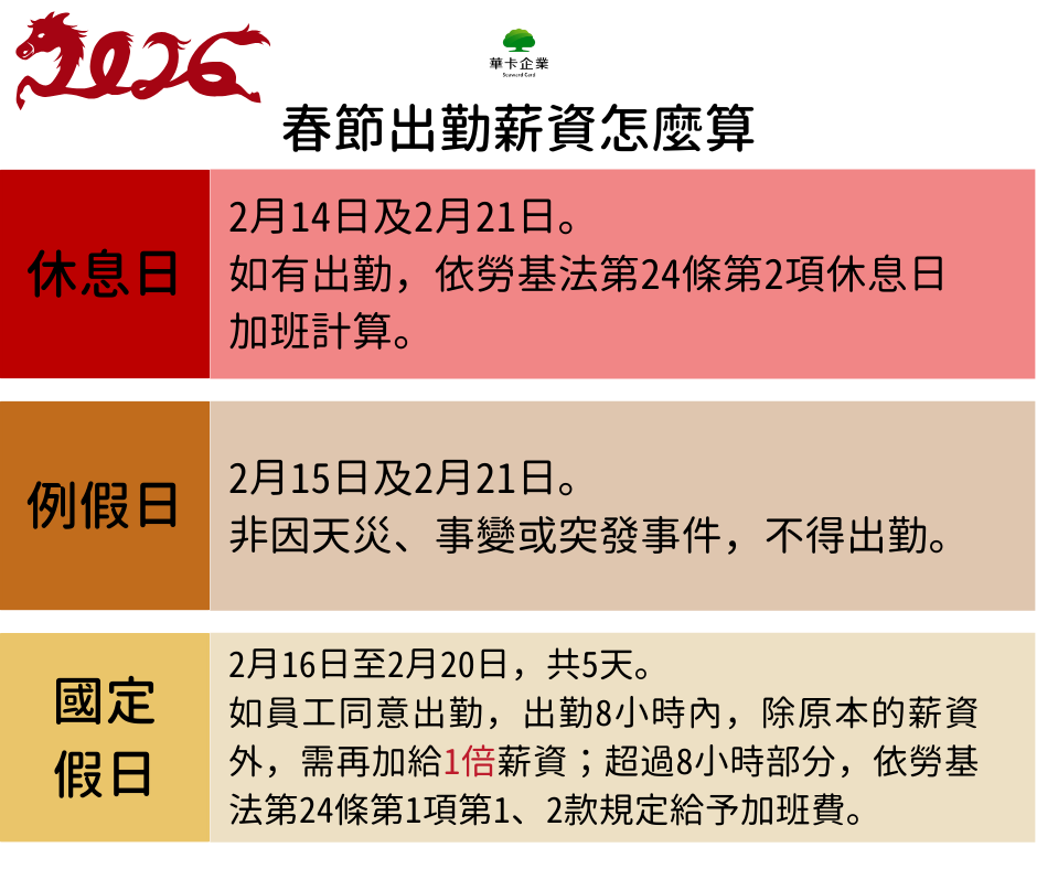 二、國定假日:依《勞動基準法》第39條規定,休假日出勤加倍發給工資。